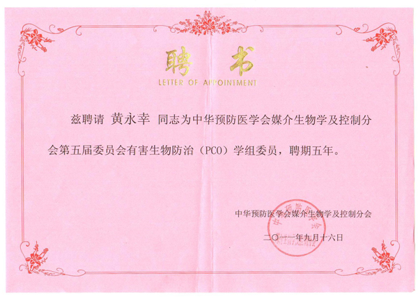 2011年9月16日公司总经理黄永幸先生当选中华预防医学会媒介生物学及控制分会第五届委员会有害生物防治(PCO)学组委员。