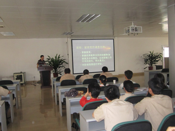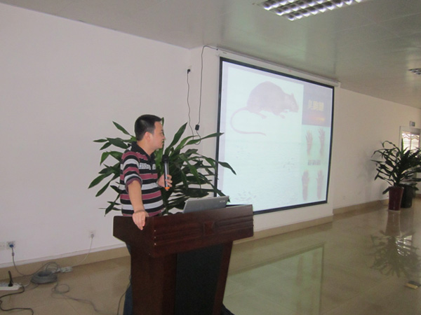 受大型外资企业大海粮油(防城港)有限公司邀请,2011年11月8日康净公司派出技术副总监古凡煜先生到该企业讲授病媒生物防制专业理论知识。图为古凡煜副总监在会上授课