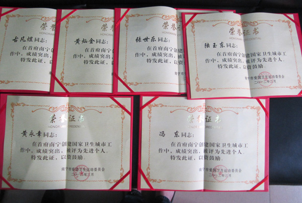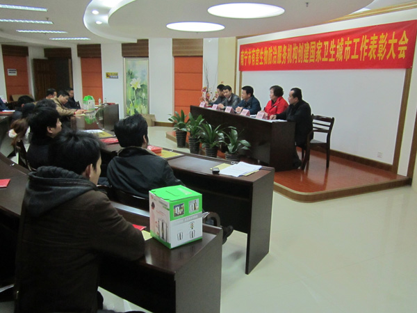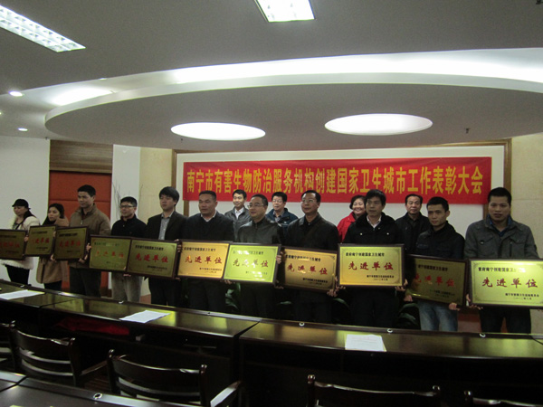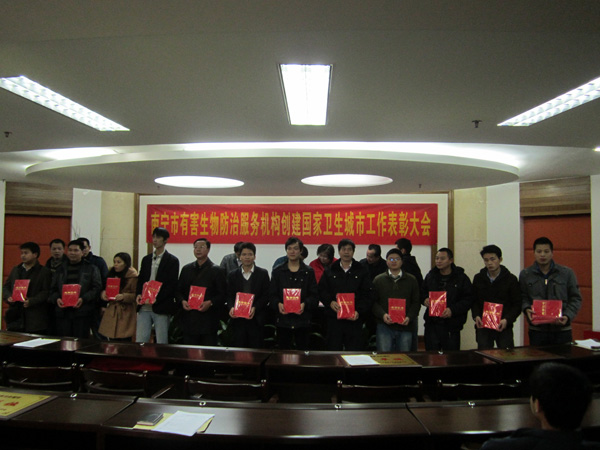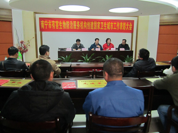 2012年3月8日,由南宁市爱卫办组织在市卫生局隆重举行了“南宁市有害生物防治服务机构创建国家卫生城市工作表彰大会”,南宁市康净卫生消毒杀虫有限责任公司在首府南宁市创建国家卫生城市工作中,成绩突出,被评为先进单位以及本公司冯东等6名员工被评为先进个人,图为李作庆副主任主持会议及颁发证书现场。