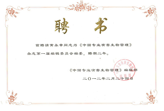 2012年2月24日公司总经理黄永幸先生当选《中国专业有害生物管理》杂志第一届编辑委员会编委。